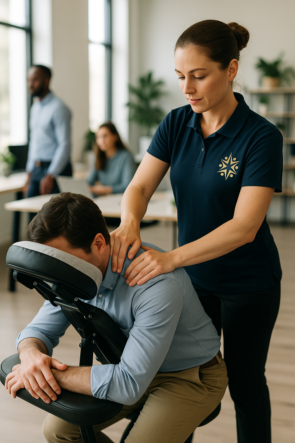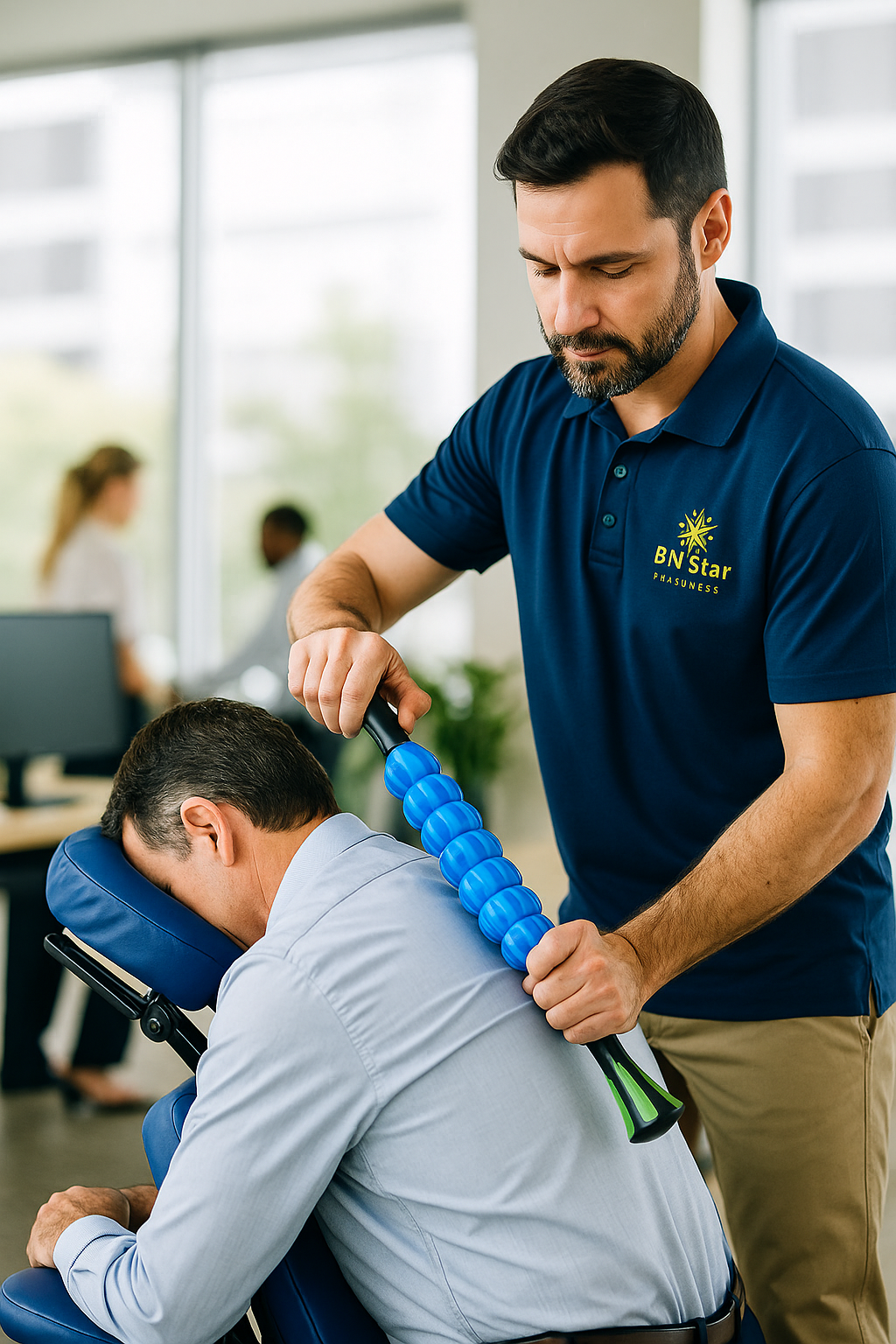 Specific focus on the back to relieve muscle tension without the need to remove clothing. On-site service with personalized attention. Designed to reduce muscle fatigue and improve posture in the workplace.